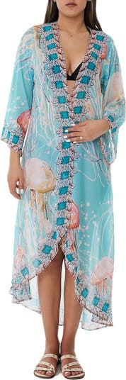 This light and airy duster is ready for tan lines and vacation vibes with its flowy longline silhouette and colorful jellyfish print.