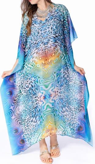 A mesmerizing bring in a rainbow of tie-dyed hues brightens this floaty caftan that's perfect for your next beach getaway.