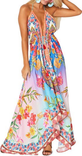 Ombré hues create a backdrop for a tropical floral printed halter dress that is framed with rose and filigree border patterns.