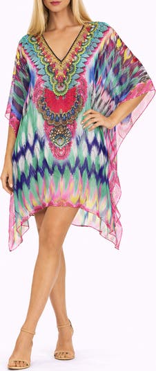 Flow from the resort to dinner on the beach in this poncho framed by three-quarter sleeves and covered in a bold print.