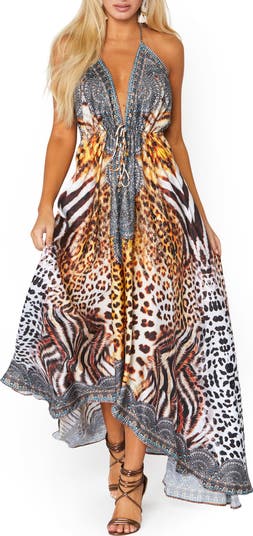 Flow from the resort to dinner on the beach in this boldy patterned maxi dress styled with a plunging halter neck and asymmetrical hem.