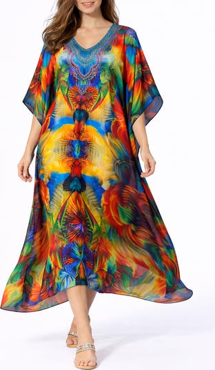 Ideal for sun-drenched getaways and barefoot strolls, this vibrant caftan is framed with a V-neckline and three-quarter sleeves.