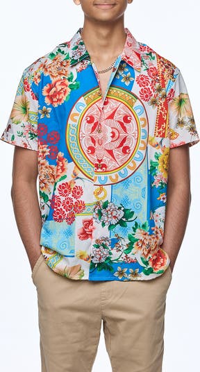 Colorful print and a laid-back loose fit gives this summery camp shirt resort-ready style.