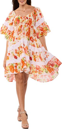 Lace inset trim lends a sweet touch to the warm‑weather styling of this minidress cut from breathable cotton and covered in blooms.