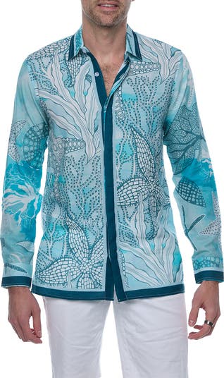 Ocean-inspired prints bring resort-ready style to this lightweight button-up shirt cut from a breathable linen-cotton blend.