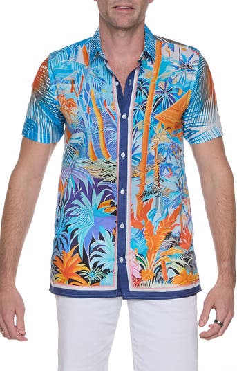 An island-inspired print brings resort-ready style to this short-sleeve button-up shirt cut from a breathable linen-cotton blend.