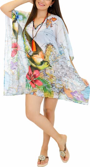 Flow from the resort to dinner on the beach in this V-neck poncho framed by three-quarter sleeves and covered in a map-inspired pattern.