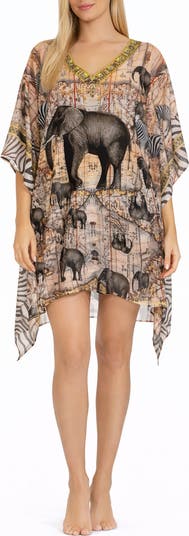 Flow from the resort to dinner on the beach in this V-neck poncho framed by three-quarter sleeves and covered in a map-inspired pattern.