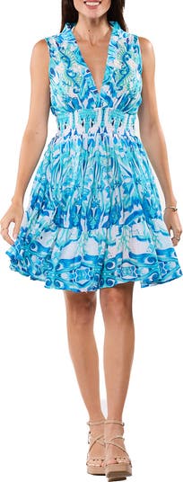 A smocked waist brings shape to this pure-cotton fit-and-flare minidress covered in ocean-blue blooms.
