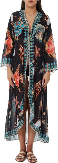 Easy and breezy, this lightweight duster is covered in a starfish print and has a longline silhouette that'll look great over your favorite swimsuit on your next vacation.