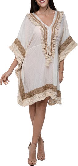 Easy-breezy and full of cabana-ready style, this tassel-trimmed, dobby-woven caftan is ready for fun in the sun.