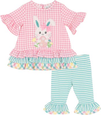Your little one will look extra cute while celebrating Easter in this gingham-check ruffled top paired with striped leggings.