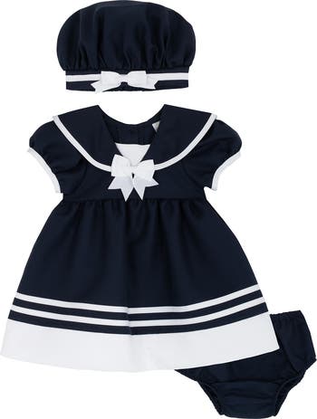 A matching cap completes baby's look in a nautical-inspired dress and bloomers set sweetened by a Peter Pan collar and striped trim.
