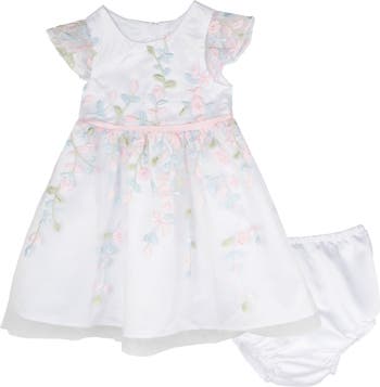 Your tiny tot will feel their finest in this party-perfect dress exploding with colorfully embroidered flowers over airy mesh and flutter short sleeves.