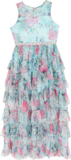 Give your kid party-ready sparkle with this glittery mesh dress featuring a pretty floral print, rhinestone-embellished waist and a ruffle-tiered skirt.