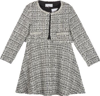 An embroidered collar adds a charming trim to a matching dress set made of bouclé knit and rich velvet.