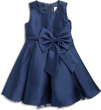 A large bow channels the coquettish aesthetic at the front of a party dress crafted from luxe mikado fabric that gives off a subtle sheen.