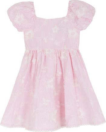 Floral embroidery and puffy sleeves define a party-ready dress that has your kiddo looking posh at any special event.
