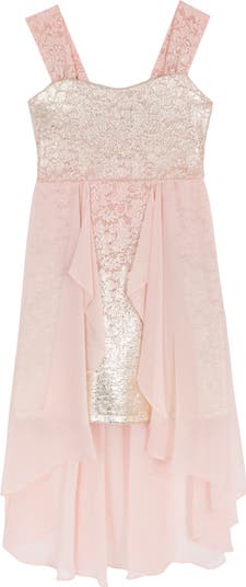 They'll dazzle in this delightful floral lace dress featuring a metallic sheen and flowy chiffon accents.