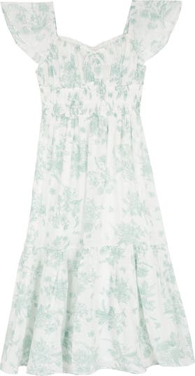 Frilly cap sleeves, a lace-trimmed smocked bust and a cute bow charm this single-tiered floral dress they'll love to spin in.