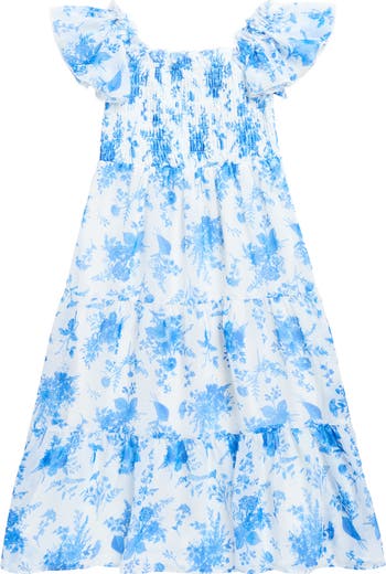 Ideal for sunny days and special occasions, this charming dress cut from floral toile fabric and features a smocked bodice, single-tiered skirt and fluttery sleeves.