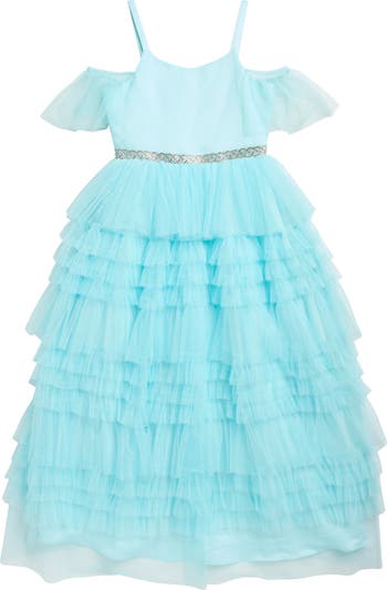 Cold-shoulder sleeves add to the party-ready vibe of a woven dress complete with a tiered skirt that ensures twirling and sashaying become second-nature.