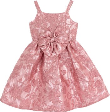 Your little fashionista will serve darling style in a sleeveless party dress with an oversize bow and brocade embroidered flower blossoms glittering with metallic threads.