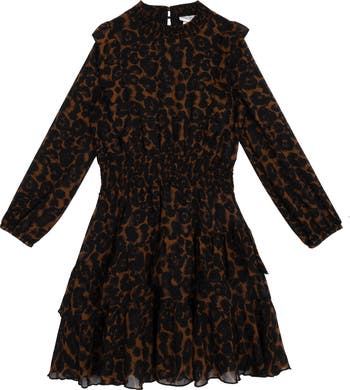 A smocked waist offers a perfect fit with every wear of this long-sleeved dress covered in leopard spots.