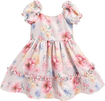 Your little darling will make an impression in this party-ready dress featuring ruffle-tiered puff sleeves and a twirl-worthy skirt made for a special occasion.