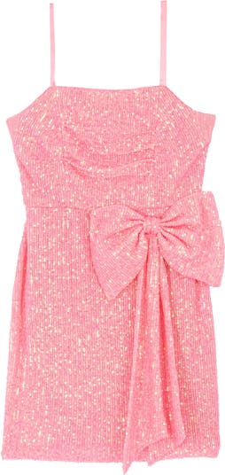 A large bow and shimmery sequins lend coquettish vibes to a party dress that perfectly reflects the light of the dance floor.