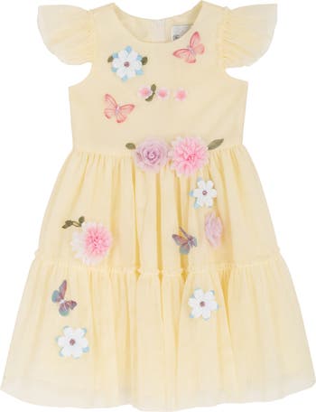 Pretty butterflies and dimensional blooms animate a woven dress that has your little love looking posh during special occasions.