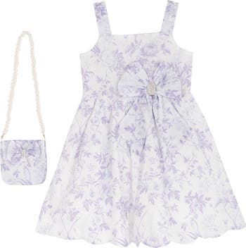 Soft blooms, pearly beads and shimmery rhinestones define a dress and crossbody bag set that your kiddo will love to style on special outings.
