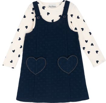 Your little fashionista will serve darling style in a coordinated set featuring a long-sleeve, heart-print top paired with a jumper dress detailed with heart-shaped pockets.
