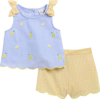 Sweeten baby's warm-weather wardrobe with this seersucker set featuring a lemon-covered top and coordinating bloomers.
