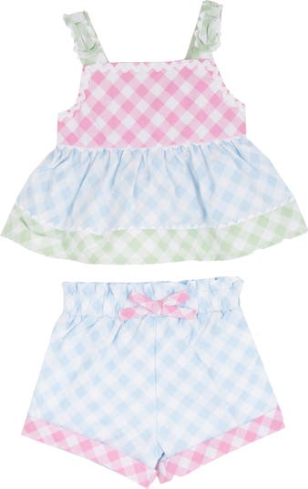 Give your baby an adorable for playtime and sunny days with this colorful mixed-gingham outfit that pairs a peplum-style tank with matching shorts.