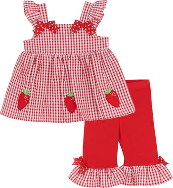 Baby will be ready for warm-weather days in this lovely set featuring a strawberry-appliqué top and coordinating capri leggings.