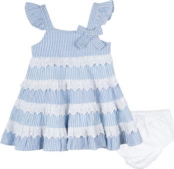 Sweet eyelet lace trims the tiers of this darling striped yarn-dyed cotton dress, complete with matching bloomers.