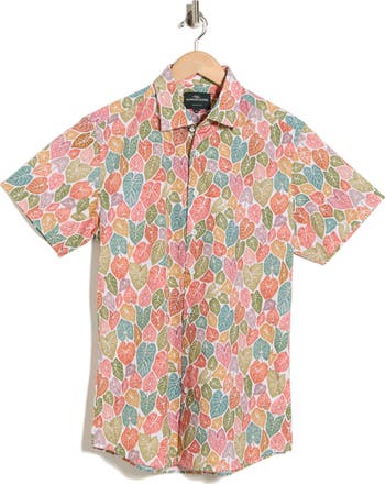 This short-sleeve shirt features a bold tropical leaf print in natural tones and is made from cotton for an easy, laid-back warm-weather look.