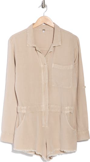 A breathable linen-blend fabric gives a comfortable, summer-ready feel to an easy, one-and-done romper. Long sleeves and a spread collar are made more casual with a well-worn mineral wash and frayed short hems.