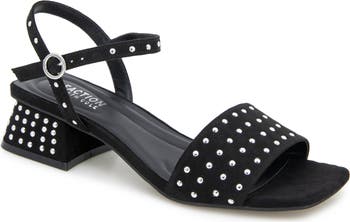 Dazzling rhinestones add a dose of glam to the smooth upper of a slingback sandal set on a cushioned footbed and flared block heel.