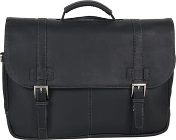 This Colombian leather double gusset flapover bag holds most laptops with up to a 15.6" screen, and is compatible with most tablets. - Single top handle - Single adjustable shoulder strap with guard - Foldover flap with dual buckle strap press-lock closures - Exterior features 1 front zip pocket with 2 slip pockets, 2 pen slots, and 4 card slots, and 1 back slip pocket - Interior features 1 padded laptop sleeve and 2 slip pockets - Approx. 16" W x 12.5" H x 4" D - Approx. 2.25" handle drop, 10-20" strap drop - Made in USA
