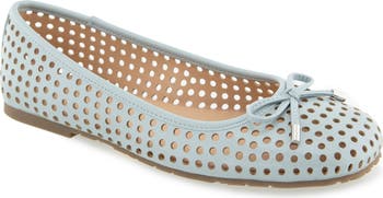 Round perforations and a charming instep bow distinguish a square-toe flat made from sleek faux leather and fitted with a padded-sock design for comfort and flexibility.