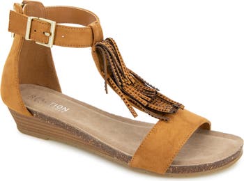 Rhinestone-embellished fringe amplifies the party-ready attitude of a T-strap sandal fashioned with an easy back-zip closure and low wedge heel.
