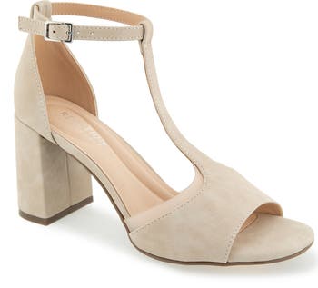 A T-strap silhouette lends a refined look to a heeled sandal crafted from soft faux suede that gives off timeless elegance.