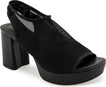 A peep toe and block heel balance a sleek platform sandal fashioned with a slingback strap for a secure fit.