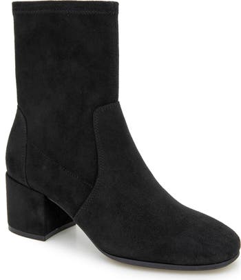 A smooth faux-suede upper hugs your foot in an ankle-high bootie lofted by a stacked block heel for a lift that's easy to walk on.