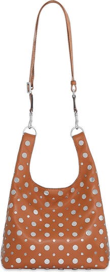 Studded hardware brightly shines against the faux-leather silhouette of a shopper tote boasting a roomy interior to suit your everyday needs.