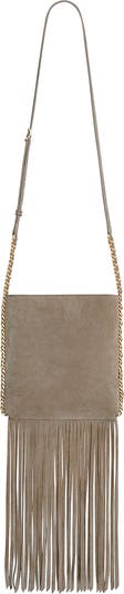 Fringed trim adds a fun flourish to a suede crossbody bag fashioned with an ultraslim profile to make it an easy option on festival days or weekend outings.
