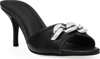 Gleaming chain hardware enhnaces the modern glamour of an almond-toe sandal lofted on a slim heel.