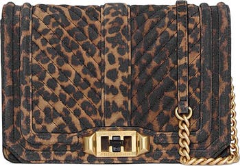 Chevron quilting adds to the visual intrigue of an animal-patterned crossbody bag crafted from leather and suspended from a polished chain strap.